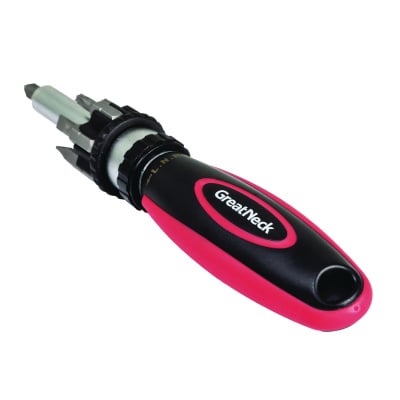 Multipurpose design makes it easy to keep the right tool for just about any job handy. This Ratcheting Screw/Nut Driver Set includes a generous range of precision-ground, sandblasted steel bits and precision-machined, chrome-vanadium steel sockets to ensure accuracy and long-lasting, reliable performance. Reversible driver features a three-position selector switch for clockwise and counterclockwise ratcheting as well as a center lock for standard screw and nut driver performance. Constructed for performance, comfort and durability, the in-line driver features a chrome-vanadium steel shaft, plus an ergonomic, rubberized handle grip to help prevent user fatigue. For added convenience, the set also includes revolver-style bit organizers for keeping six screwdriver bits with you, tucked neatly on the driver's shaft. Screwdrivers and Nut Drivers Tool Type: Ratchet Screwdriver Set; Tip/Socket Type(s): Phillips; Slotted; Star; Tip/Socket Size(s): #1 Phillips; #2 Phillips; 3/16" Slotted; 1/4" Slotted; T10 Star; T15 Star; T20 Star; Overall Length: 7"