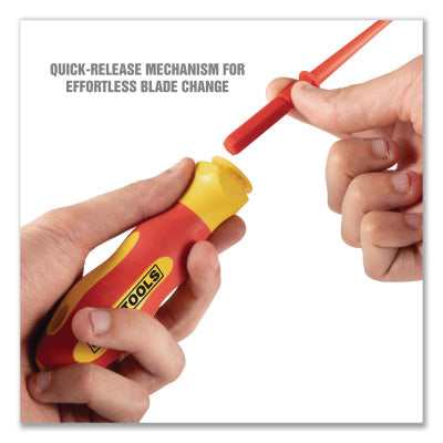 Clearly marked with an official 1,000-volt rating symbol, OEMTOOLS Insulated 10-Piece Interchangeable Bit Screwdriver Set includes eight interchangeable insulated blade bits and two insulated handles. Handles and insulated shanks provide excellent protection against electrical shocks while also delivering flame and impact resistance. Slim-tip to fit-tight terminal blocks ensure the blade-bits remain securely in place when on the job. Push-button auto-eject mechanisms on each precision-grip handle ensures simple and easy blade-bit changes. Store the whole set securely with the included protective roll pouch. This set's perfect for compact storage on your tool belt, in your toolbox or under your work vehicle's front seat. Screwdrivers and Nut Drivers Tool Type: Screwdriver Set; Tip/Socket Type(s): Metric Phillips; Metric Slotted; Tip/Socket Size(s): 3 mm Slotted; 4 mm Slotted, 5.5 mm Slotted; 6.5 mm Slotted; PH1 Phillips; PH2 Phillips; PZ1 Phillips; PZ2 Phillips; Overall Length: 8.25".